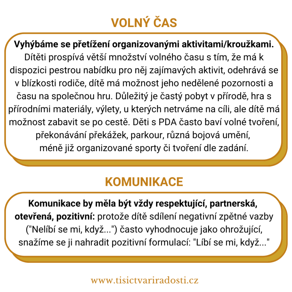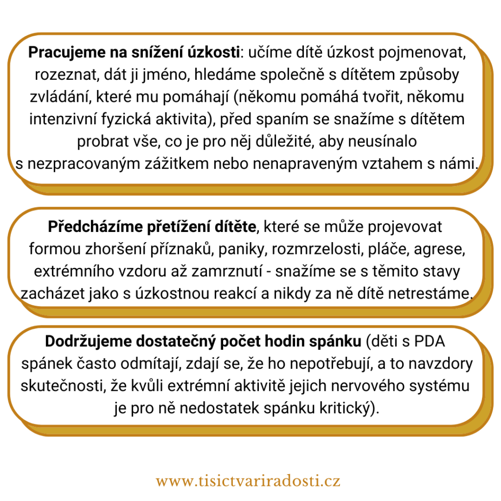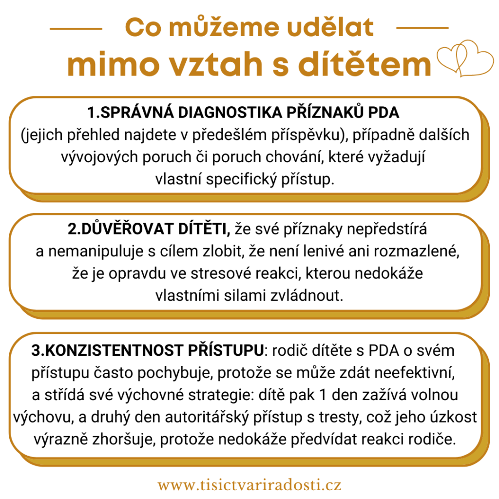Dalším náročným krokem je zvládnout paradox výchovy dítěte s PDA, a to, že péče o něj svádí k přehnané péči a kontrole, které mu ale dál ubližují a vytváří bludný kruh (rodič, který opakovaně nedokáže přimět dítě ke spolupráci, to nakonec udělá za něj, příště bude ale vyvíjet ještě větší tlak, který vyvolá u dítěte ještě větší vyhýbavost chování). Před sebou pak často vidíme 8-leté chytré, samostatné a schopné dítě, které odmítá jíst, spát, mýt se, obléct se, i když už i samo chce, a potřebuje vaši důvěru, že jeho prožívání je pravdivé.
