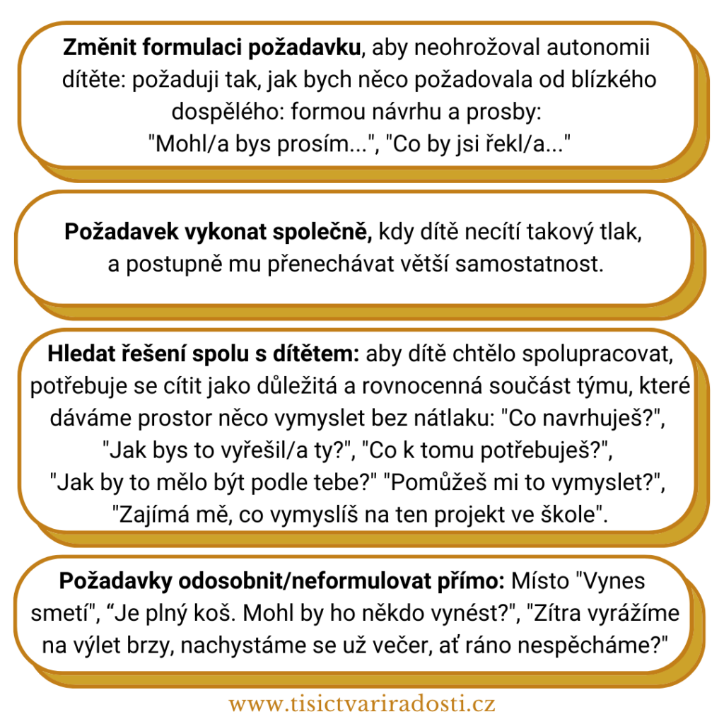 Budete se učit, že na každém slovu záleží. Budete muset přehodnotit vše, co jste si mysleli, že je důležité. Důvěřovat, že to, co dítě dokáže nebo nedokáže ve stavu stresu (což je každý klasicky formulovaný požadavek), nevypovídá o tom, čeho je, nebo není schopné. Že dítě dovednosti může ovládat (a dokáže je použít v situaci, kdy je opravdu potřebuje), i když jimi neodpovídá vždy na očekávání rodiče či vnějšího světa. Že dítě empatickým přístupem nerozmazlujete, ale snižujete zvýšenou hladinu jeho stresu a intenzitu obranné reakce, a budujete zdravou citovou vazbu.