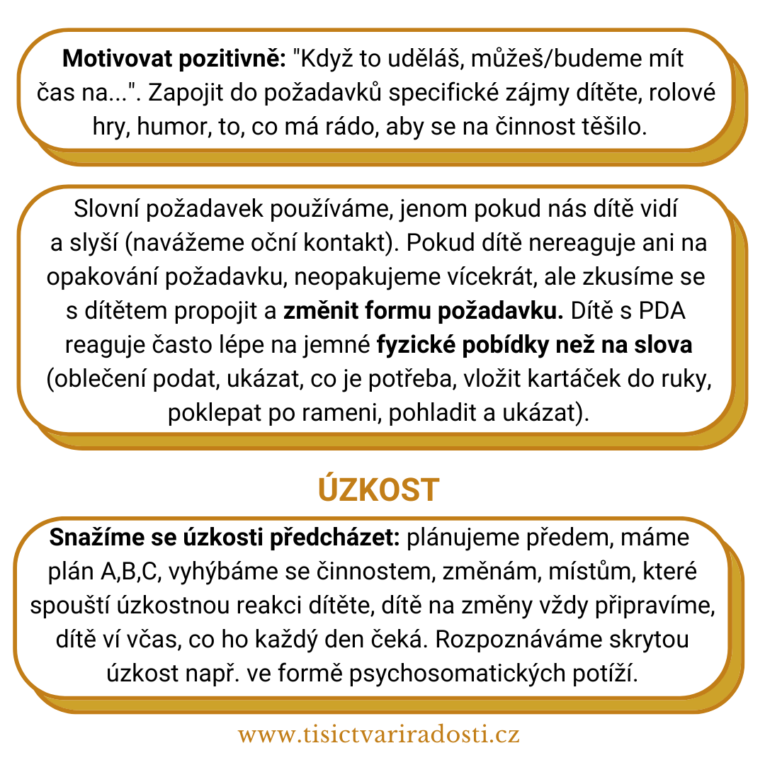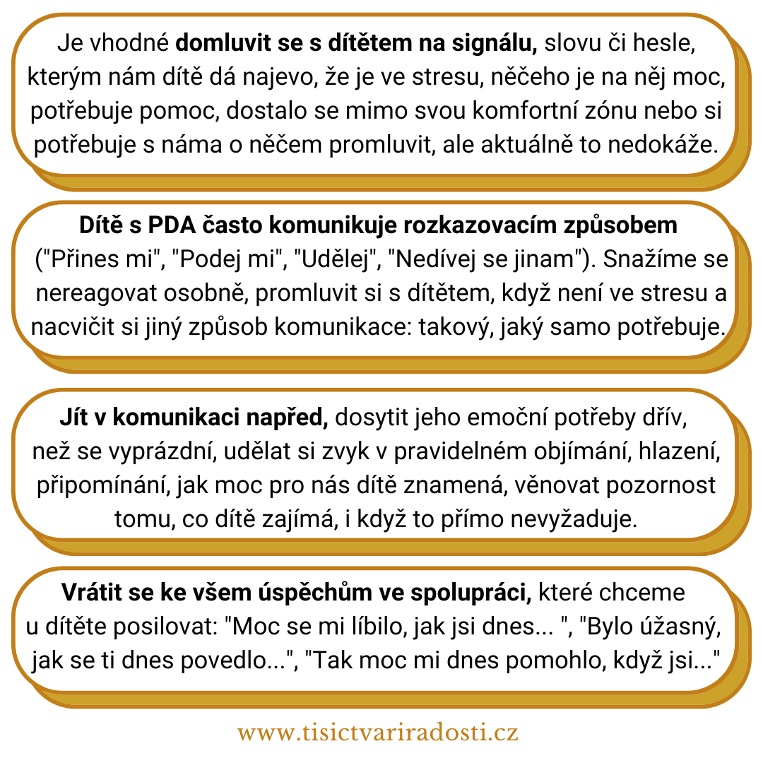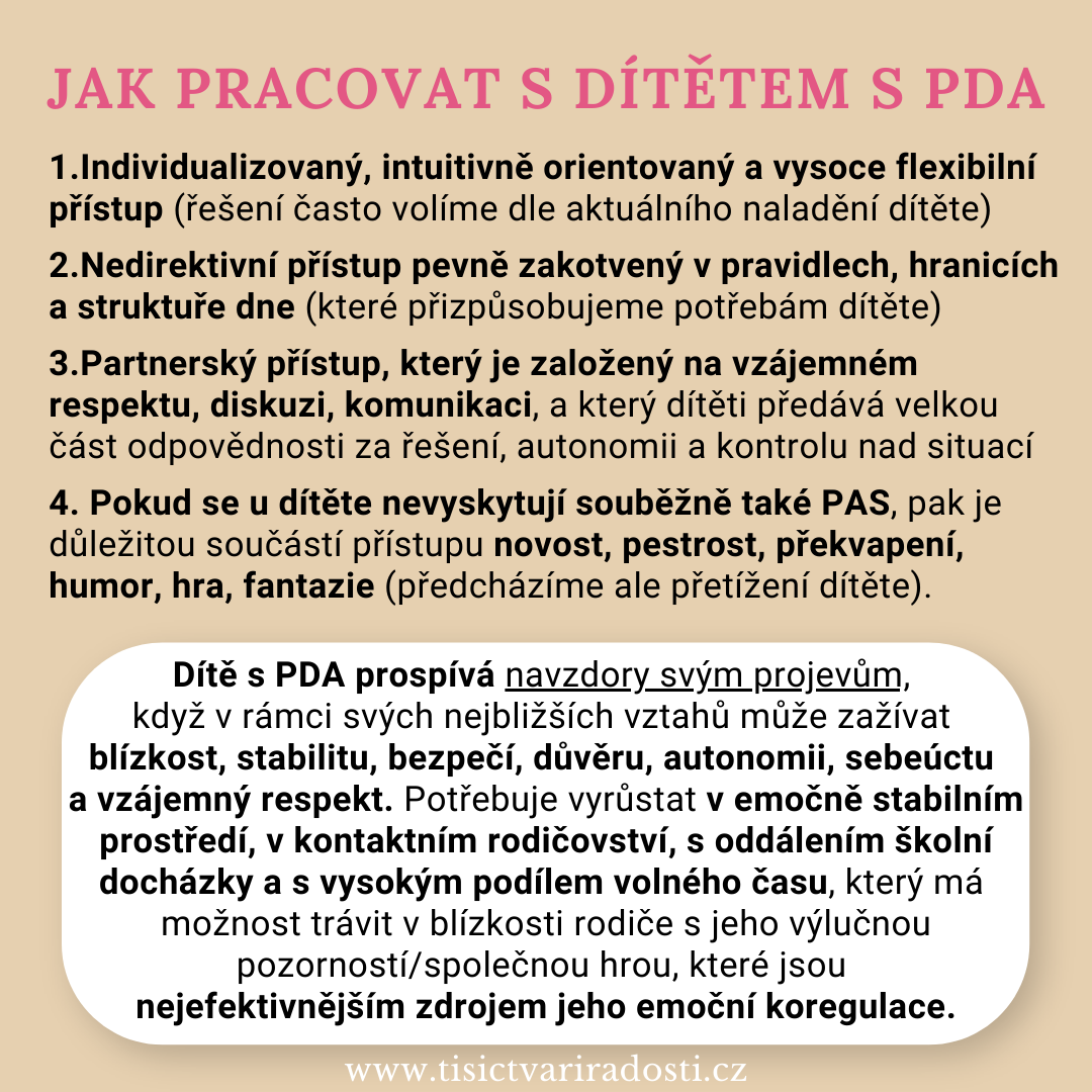Dalším náročným krokem je zvládnout paradox výchovy dítěte s PDA, a to, že péče o něj svádí k přehnané péči a kontrole, které mu ale dál ubližují a vytváří bludný kruh (rodič, který opakovaně nedokáže přimět dítě ke spolupráci, to nakonec udělá za něj, příště bude ale vyvíjet ještě větší tlak, který vyvolá u dítěte ještě větší vyhýbavost chování). Před sebou pak často vidíme 8-leté chytré, samostatné a schopné dítě, které odmítá jíst, spát, mýt se, obléct se, i když už i samo chce, a potřebuje vaši důvěru, že jeho prožívání je pravdivé.