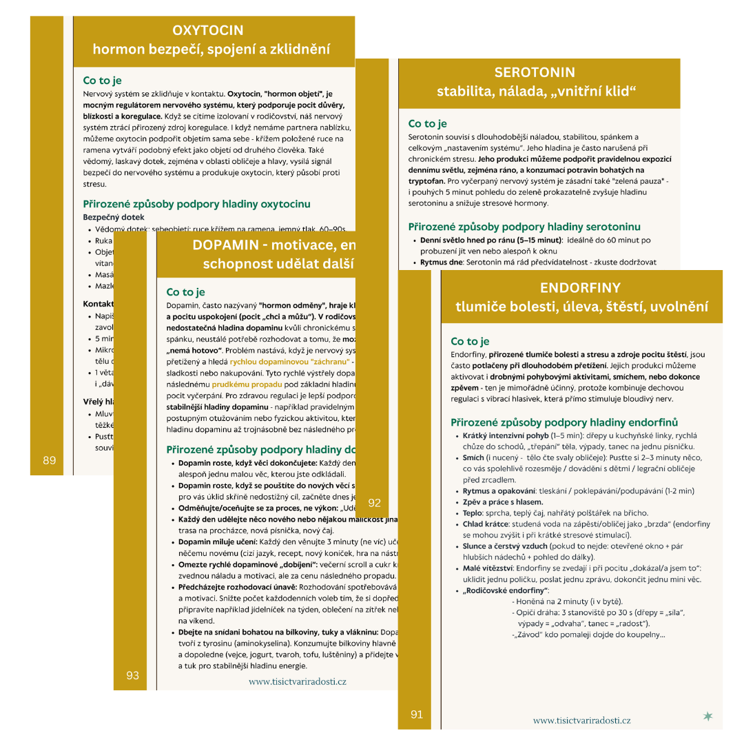 - Techniky přirozené podpory zdravé hladiny hormonů (oxytocinu, endorfinů, serotoninu a dopaminu) jako klíč k obnově rodičovského nervového systému