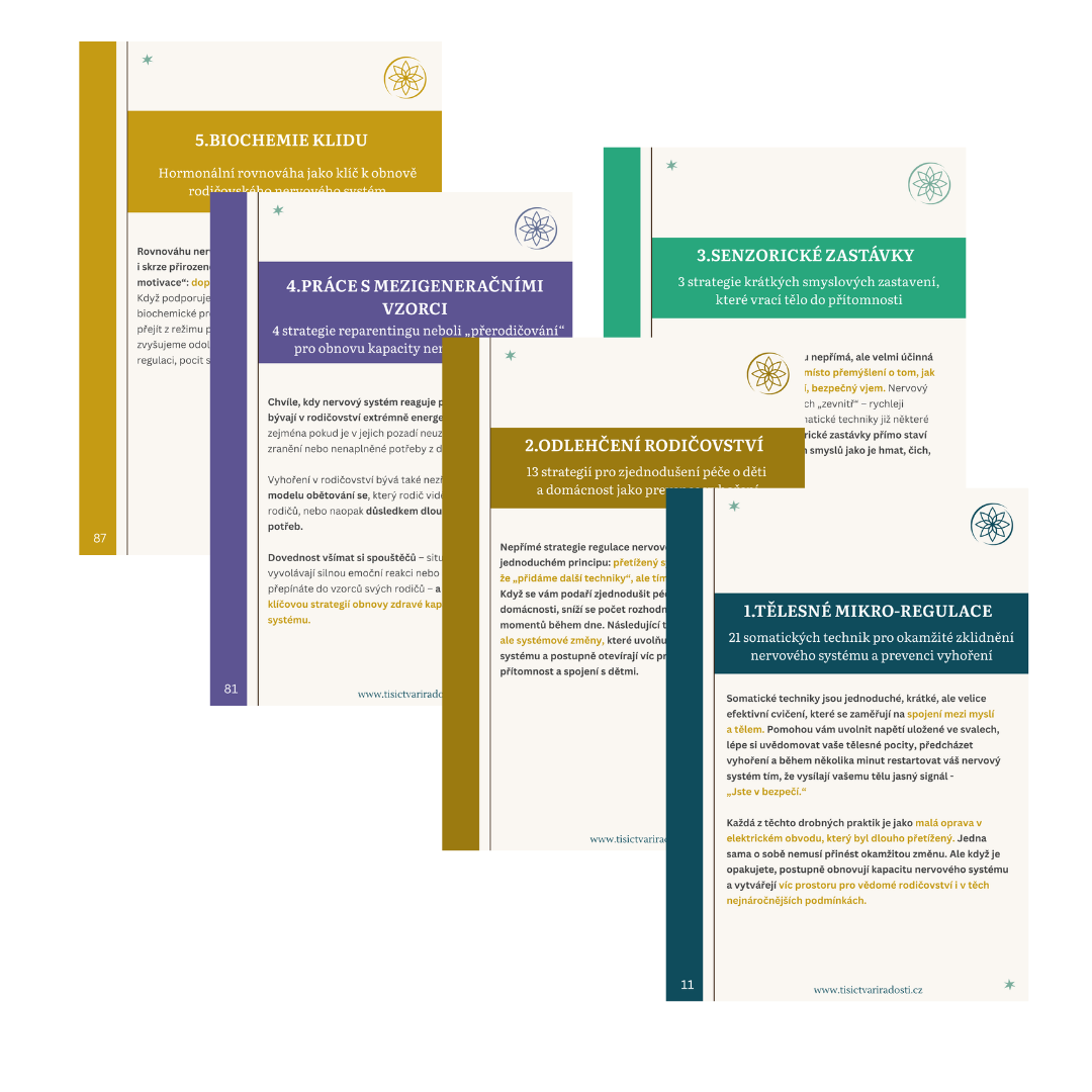 Dobrá zpráva je, že i MALÉ, PRAVIDELNÉ DÁVKY MIKRO-ODPOČINKU, jemných somatických technik (které pomáhají nervovému systému vnímat bezpečí a vracet se do stavu regulace), jednoduchých rituálů pro zjednodušení dne s dětmi a vědomého zpomalení mohou nervovému systému pomoci